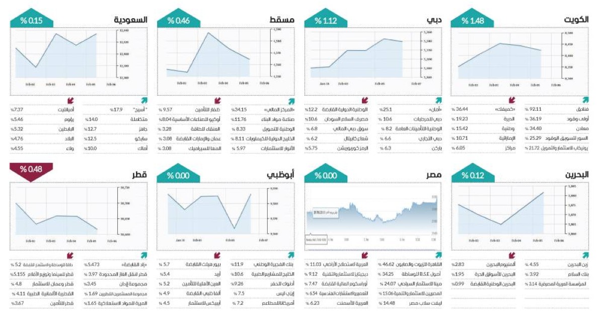 سجلت معظم الأسواق العربية ارتفاعاً خلال الأسبوع الأول من فبراير الجاري، وهو الأسبوع الذي راقب فيه المستثمرون عديداً من الأحداث الاقتصادية الساخنة، سواء على الأصعدة المحلية أو على الصعيد الدولي.