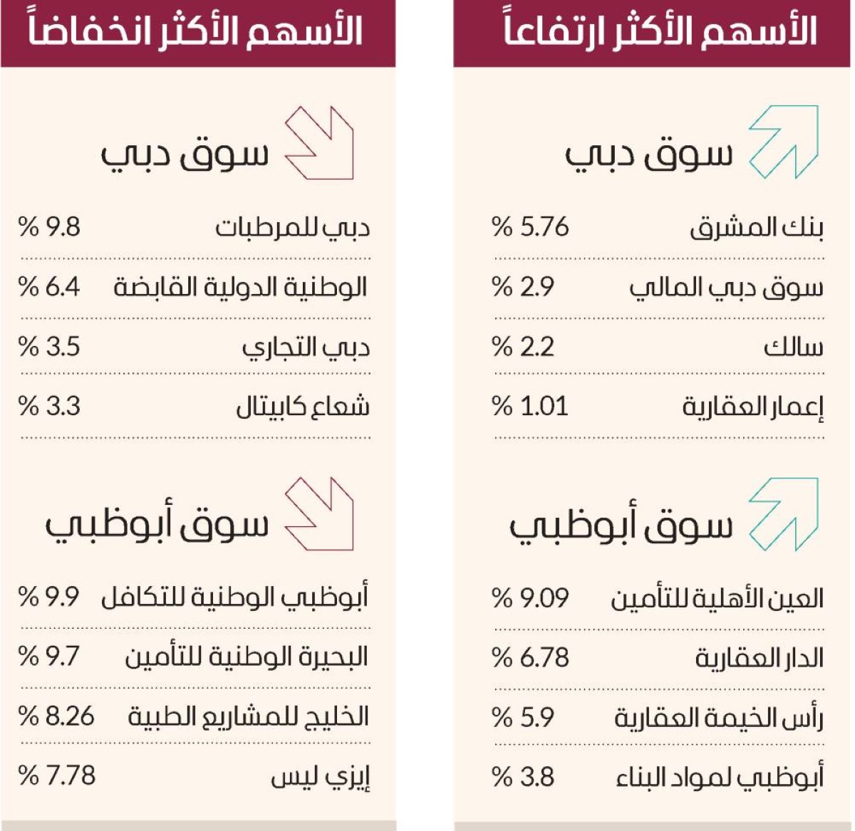 وصعدت في سوق أبوظبي أسهم العين اﻷهلية للتأمين 9.09 %، والدار العقارية 6.78 % مسجلاً أعلى إغلاق منذ جلسة سبتمبر 2008، ورأس الخيمة العقارية 5.9 %، وأبوظبي الوطنية لمواد البناء 3.8 %.