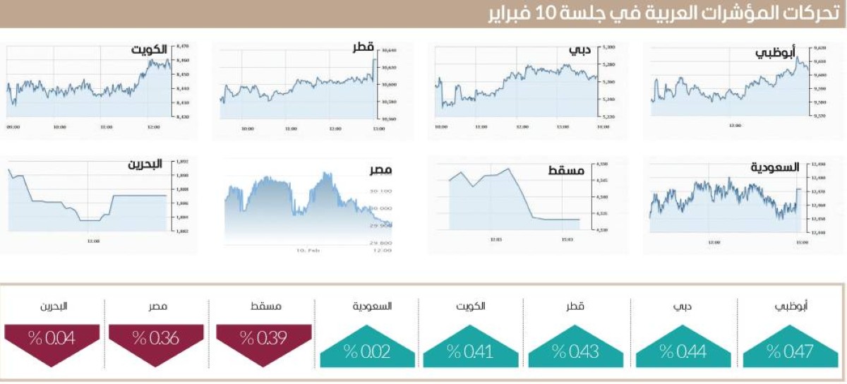 وعلى مستوى البورصات العربية، شهدت معظم أسواق الأسهم العربية ارتفاعاً بالأداء في ختام تعاملات أمس، وصعد «تاسي» السعودي 0.02 %، والكويت 0.41 %، وقطر 0.43 %، في حين خالفت بورصة مسقط بتراجع 0.39 %، والبحرين 0.04 %، وخارج منطقة الخليج، تراجع مؤشر بورصة مصر 0.36 %.