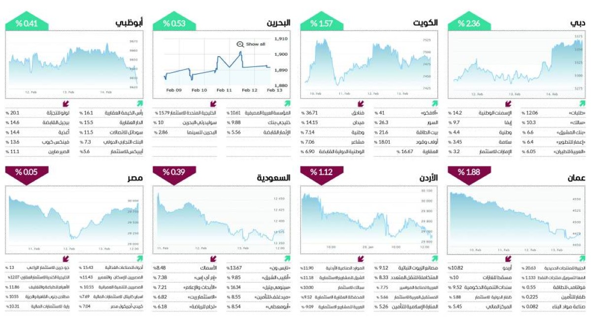 خيم اللون الأحمر على معظم الأسواق العربية، خلال تعاملات الأسبوع الثاني من شهر فبراير، وهو الأسبوع الذي كسر فيه المؤشر السعودي سلسلة مكاسبه الأسبوعية المتصلة، مسجلاً تراجعاً محدوداً، بينما تمكنت المؤشرات الكويتية خلاله من المحافظة على تسجيل رابع أداء أسبوعي إيجابي على التوالي.
