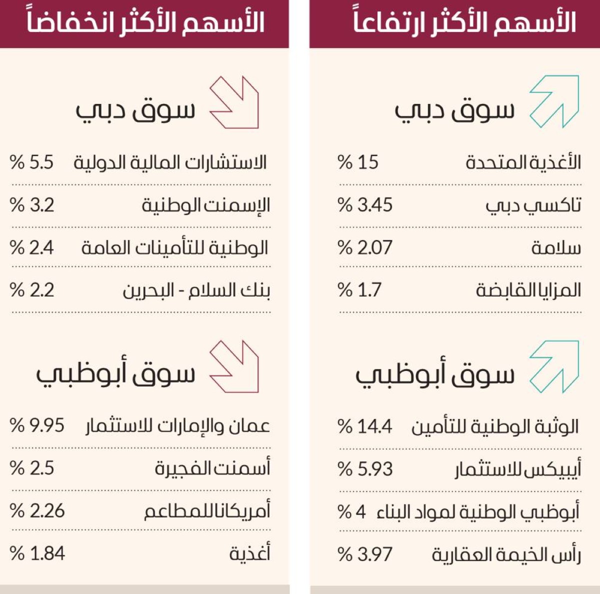 وارتفعت أسهم الوثبة الوطنية للتأمين 14.4% بالحد الأقصى، وأيبيكس للاستثمار 5.93%، وأبوظبي الوطنية لمواد البناء 4%، ورأس الخيمة العقارية 3.97%، فيما تراجعت أسهم عمان والإمارات للاستثمار 9.95%، وأسمنت الفجيرة 2.5%، وأمريكانا للمطاعم 2.26%، وأغذية 1.84%.
