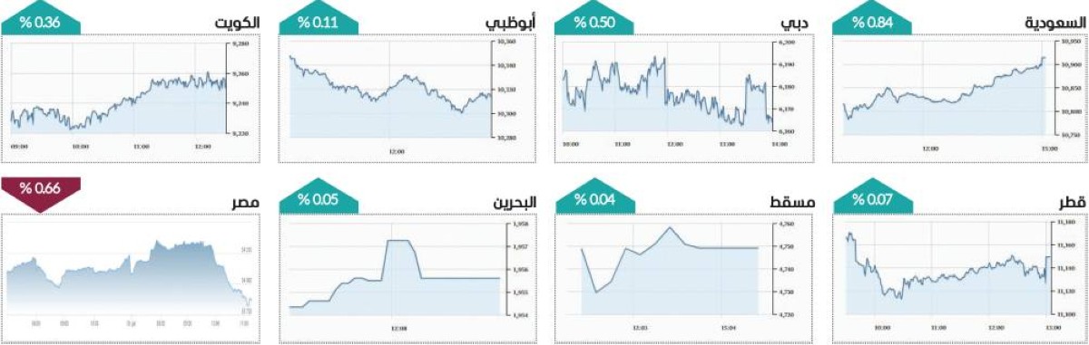 وشهدت أغلب مؤشرات الأسواق العربية ارتفاعاً في الأداء، وصعد «تاسي» السعودي 0.84%، والكويتي 0.36% والقطري 0.07%، ومسقط 0.04%، والبحرين 0.05%، وخارج منطقة الخليج، انخفض مؤشر بورصة مصر 0.66%.