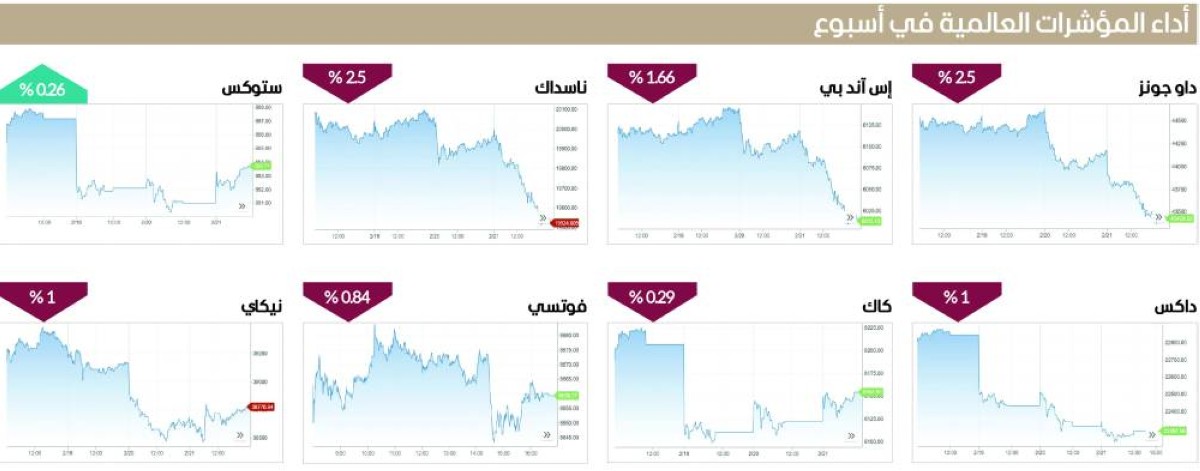 كما تراجع مؤشر إس آند بي 500 بنحو 1.66% خلال الأسبوع، مغلقاً عند 6,013.13 نقاط، مقابل 6114.63 الأسبوع الماضي. كذلك انخفض مؤشر ناسداك المركب بنسبة 2.5%، منهياً التعاملات عند مستوى 19,524.01 نقطة، مقابل 20026.77 نقطة الأسبوع الماضي.
