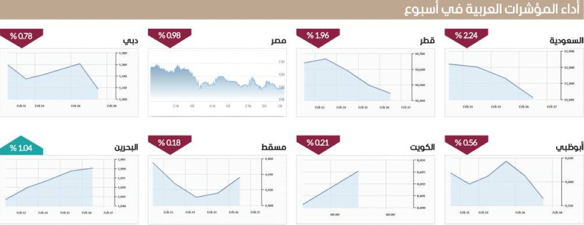 سيطر «اللون الأحمر» على تعاملات معظم البورصات العربية في الأسبوع الأخير من شهر فبراير، في الوقت الذي تستمر فيه الأسواق في محاولة استيعاب المتغيرات الاقتصادية العالمية.
