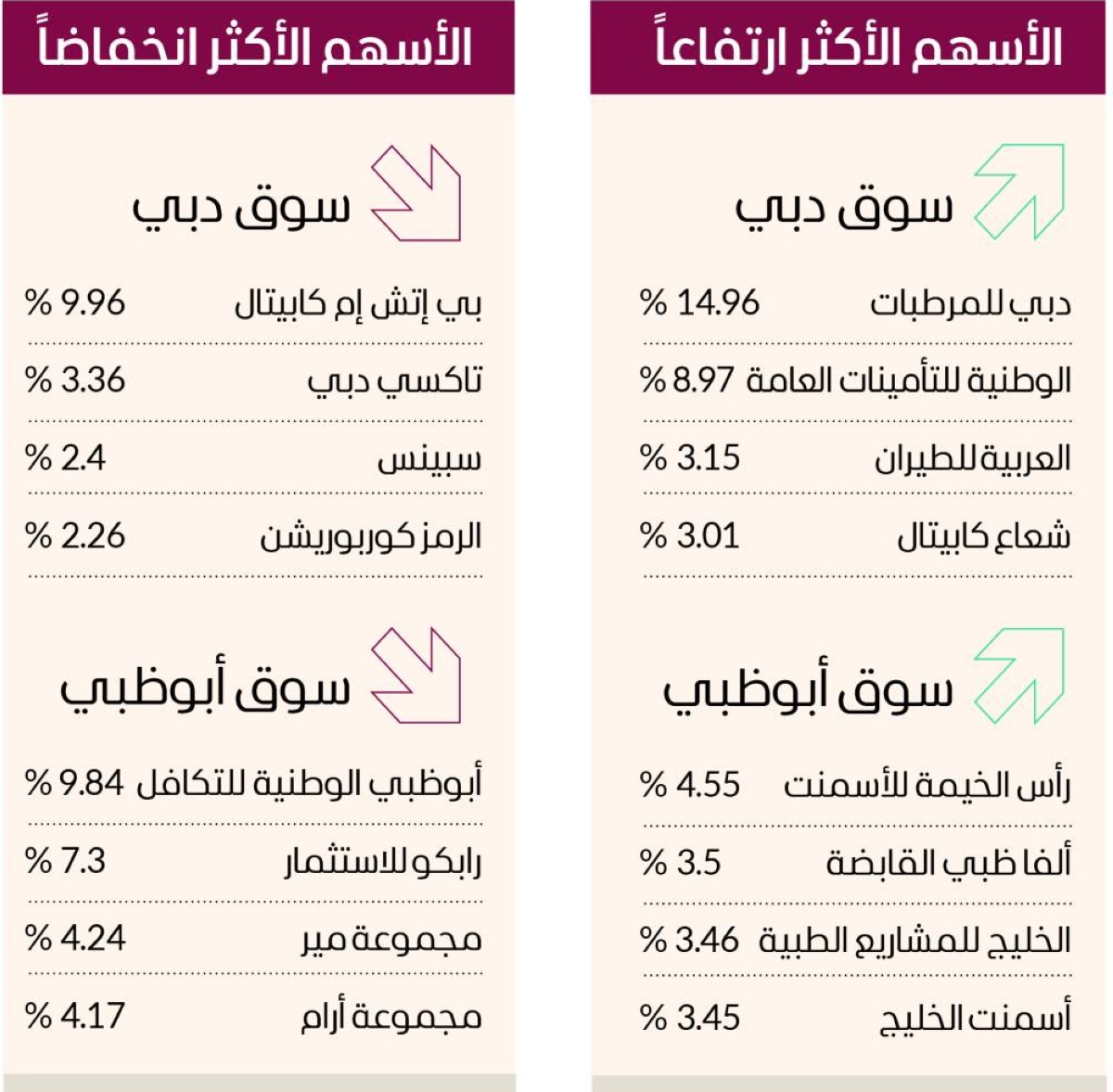 وصعدت في سوق أبوظبي أسهم رأس الخيمة للأسمنت 4.55%، وألفا ظبي القابضة 3.5%، والخليج للمشاريع الطبية 3.46%، وأسمنت الخليج 3.45%.
