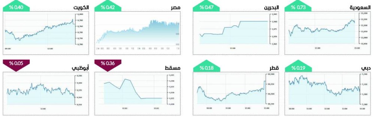 وعلى مستوى البورصات العربية، ارتفع «تاسي» السعودي 0.73%، وقطر 0.18%، والكويت 0.40%، والبحرين 0.47%، فيما تراجعت بورصة مسقط 0.36%، وخارج منطقة الخليج، صعد مؤشر بورصة مصر 0.42%.