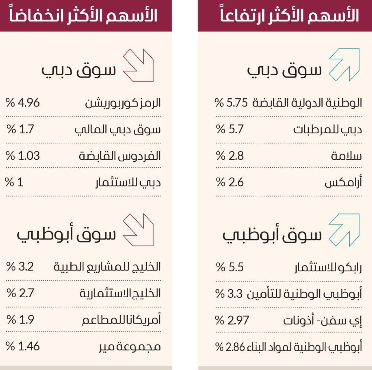 وارتفعت في سوق أبوظبي أسهم رابكو للاستثمار 5.5%، وأبوظبي الوطنية للتأمين 3.3%، وإي سفن- أذونات 2.97%، وأبوظبي الوطنية لمواد البناء 2.86%، فيما تراجعت أسهم الخليج للمشاريع الطبية 3.2%، والخليج اﻻستثمارية 2.7%، وأمريكانا للمطاعم 1.9%، ومجموعة مير 1.46%.