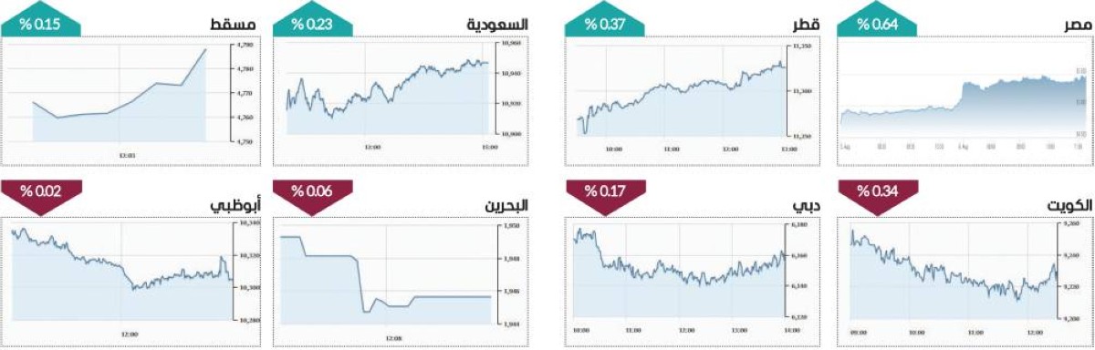 وشهدت البورصات العربية تبايناً في الأداء، إذ صعد «تاسي» السعودي 0.23 %، والقطري 0.37 %، ومسقط 0.15 %، بينما تراجعت بورصتا الكويت 0.34 %، والبحرين 0.06 %، وخارج منطقة الخليج، ارتفع مؤشر بورصة مصر 0.64 %. وارتفع مؤشر السوق السعودي «تاسي» بنسبة 0.23 % ليغلق عند 10947 نقطة، وبتداولات بلغت نحو 4.8 مليارات ريال.