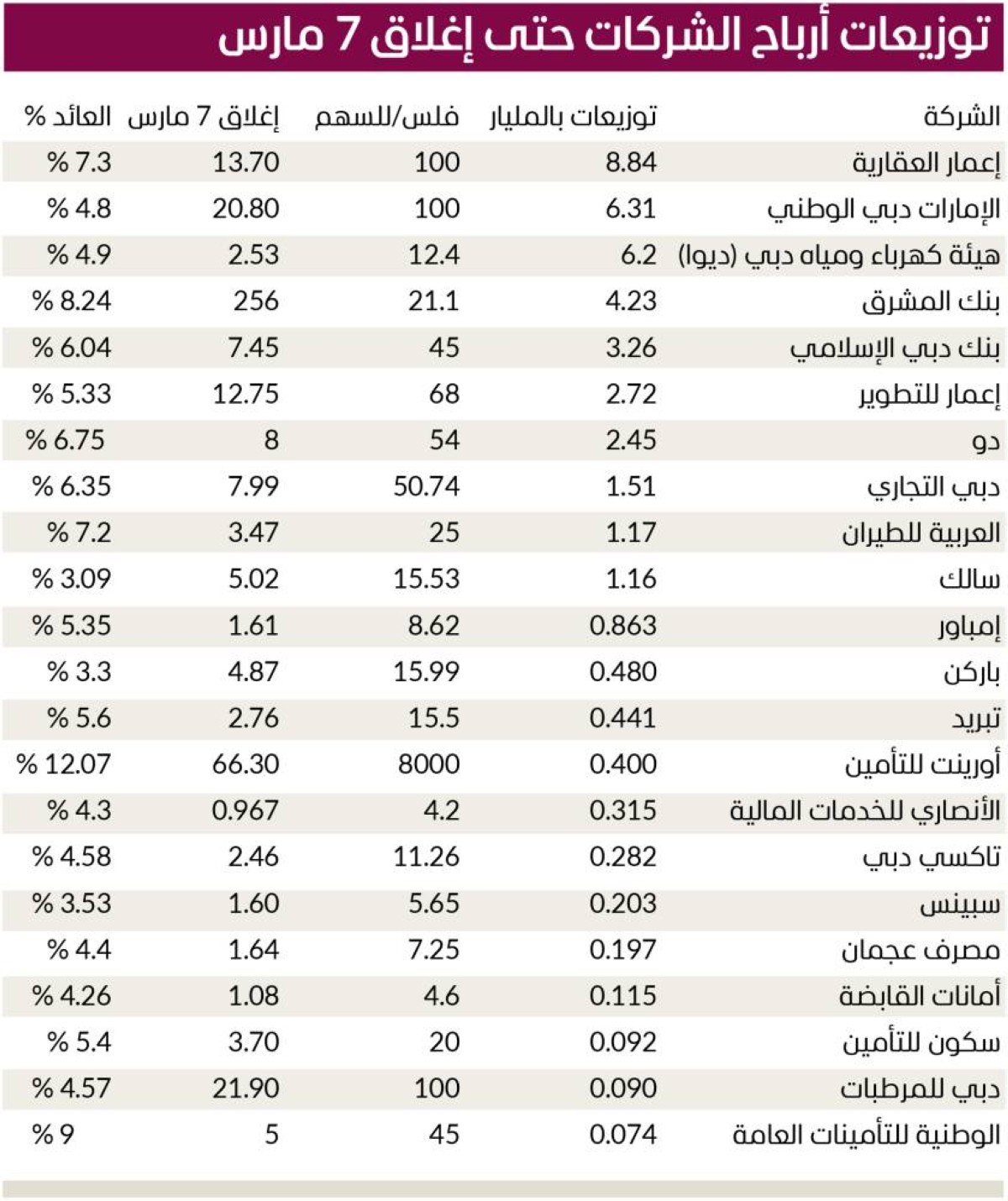 ومن حيث العائد على التوزيعات بحسب سعر إغلاق جلسة 7 مارس الجاري، سجلت «إعمار العقارية» نسبة 7.3%، و«الإمارات دبي الوطني» بنسبة 4.8%، و«هيئة كهرباء ومياه دبي (ديوا)» 4.9%، و«بنك المشرق» بنسبة 8.24%، و«دبي الإسلامي» بنسبة 6.04% و«إعمار للتطوير» بنسبة 5.33% و«دو» بـ6.75%، و«دبي التجاري» بنسبة 6.35%، و«العربية للطيران» بـ7.2%، و«سالك» بـ3.09%، و«إمباور» بنسبة 5.35%، و«باركن» بنسبة 3.3%، و«تبريد» بعائد 5.6%.