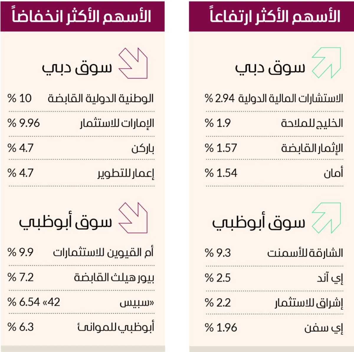 وكان ضمن الأسهم المرتفعة في سوق أبوظبي أسهم «الشارقة للأسمنت» 9.3%، و«إي آند» 2.5%، و«إشراق للاستثمار» 2.2%، و«آي سفن» 1.96%.