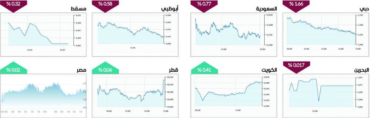 وعلى مستوى البورصات العربية، تراجع «تاسي» السعودي 0.77%، ومسقط 0.32%، والبحرين 0.017%، بينما صعدت بورصة الكويت 0.41%، وقطر 0.06%، وخارج منطقة الخليج، صعد مؤشر بورصة مصر 0.02%.
