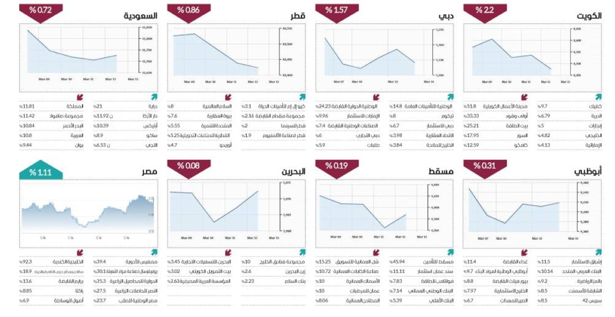 وفي سياق متصل، أنهى مؤشر البورصة السعودية تعاملاته الأسبوعية على تراجع، كما سجلت بورصات قطر والكويت والبحرين وعُمان خسائر متفاوتة، بينما خالفت البورصة المصرية الاتجاه، محققة مكاسب على مستوى المؤشرات الرئيسة، رغم التراجع في رأس المال السوقي.