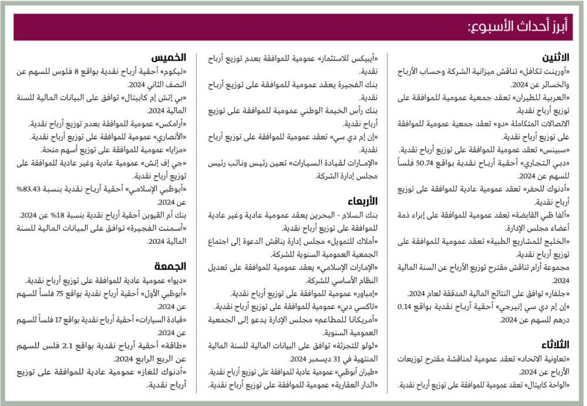 تشهد أسواق الأسهم المحلية أحداثاً عديدة خلال الأسبوع الجاري، بالتزامن مع استمرار اجتماعات الجمعيات العمومية لأكثر من 27 شركة في الموافقة على التوزيعات السخية عن عام 2024.