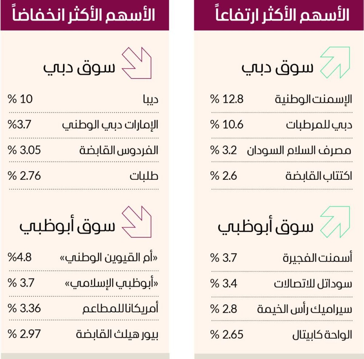 وتصدر سهم «الإسمنت الوطنية» ارتفاعات 22 سهماً بسوق دبي مرتفعاً 12.8 %، وصعدت أسهم «دبي للمرطبات» 10.6 %، و«مصرف السلام السودان» 3.2 %، و«اكتتاب القابضة» 2.6 %، و«أمان» 2.15 %، و«دبي الإسلامي» 0.53 %، فيما تراجعت أسهم «الإمارات دبي الوطني» 3.7 %، و«الفردوس القابضة» 3.05 %، و«طلبات» 2.76 %، و«إعمار العقارية» 0.37 %.