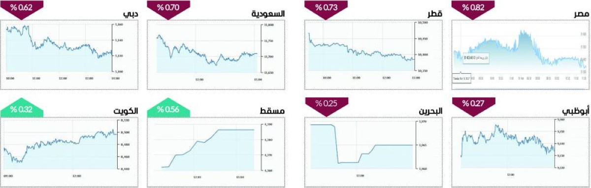 وعلى مستوى البورصات العربية، تراجع «تاسي» السعودي 0.70 %، وقطر 0.73 %، والبحرين 0.25 %، بينما صعدت بوصة الكويت 0.32 %، ومسقط 0.56 %، وخارج منطقة الخليج، انخفض مؤشر بورصة مصر 0.82 %.