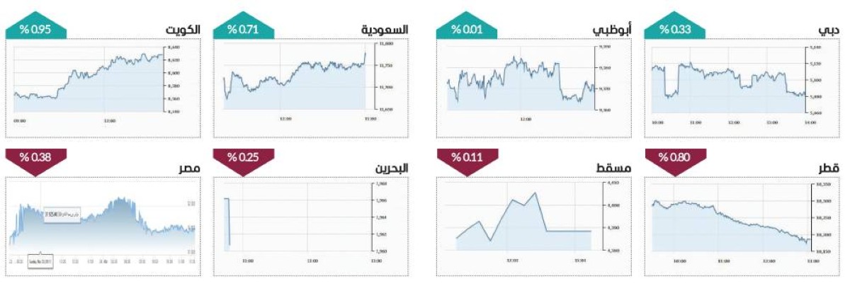 وعلى مستوى البورصات العربية، صعد «تاسي» السعودي 0.71%، والكويت 0.95%، بينما انخفضت بورصة قطر 0.80%، ومسقط 0.11%، والبحرين 0.25%، وخارج منطقة الخليج، تراجع مؤشر بورصة مصر 0.38%.