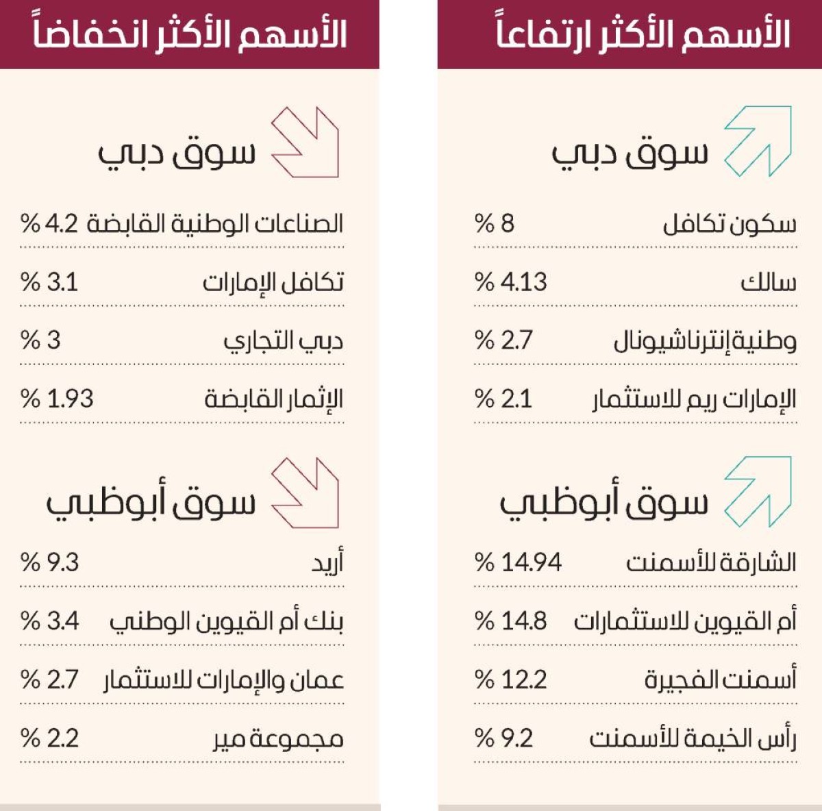 وارتفعت أسهم الشارقة للأسمنت 14.94 %، وأم القيوين للاستثمارات 14.8 %، وأسمنت الفجيرة 12.2 %، ورأس الخيمة للأسمنت 9.2 %، في المقابل، تراجعت أسهم أريد 9.3 %، وبنك أم القيوين الوطني 3.4 %، وعمان والإمارات للاستثمار 2.7 %، ومجموعة مير 2.2 %.