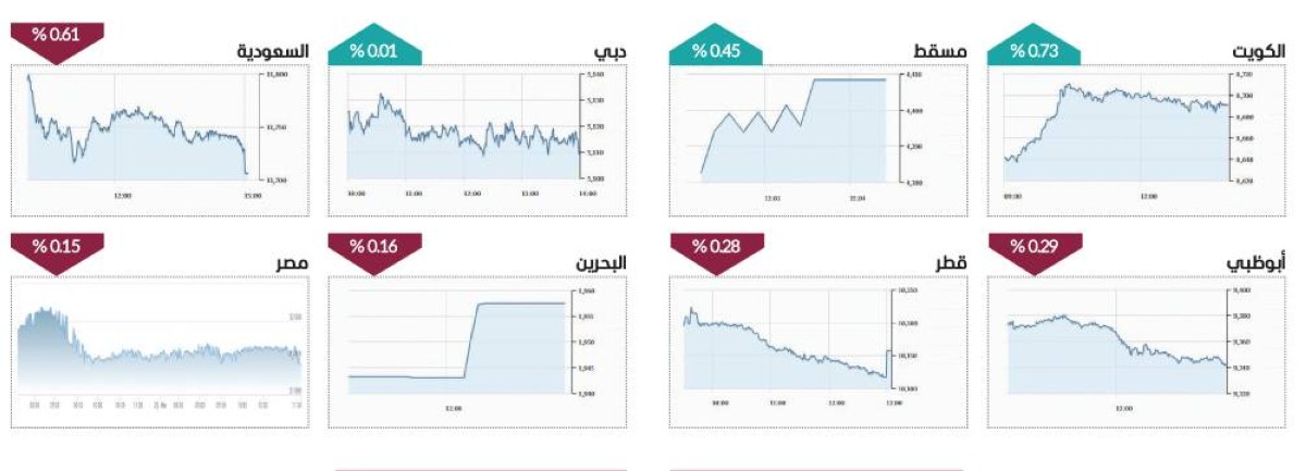وعلى مستوى البورصات العربية، تراجع «تاسي» السعودي 0.61%، وقطر 0.28%، والبحرين 0.16%، فيما ارتفعت بورصة الكويت 0.73%، ومسقط 0.45%، وخارج منطقة الخليج، تراجع مؤشر بورصة مصر 0.15%.