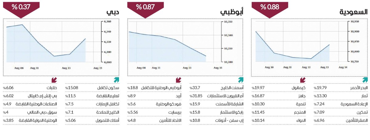 تباينت مؤشرات الأسواق العربية في الأسبوع الثاني من أغسطس، في حين ضغطت تراجعات القطاعات الكبرى على المؤشر العام في السعودية ومصر، إذ سجلت محصلة أسبوعية حمراء، وسط انخفاض أحجام وقيم التداول وتراجع رأس المال السوقي.