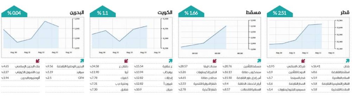 في المقابل، تمكنت بورصات الكويت وقطر ومسقط والبحرين من تسجيل مكاسب متباينة، مدعومة بمكاسب في أسهم قيادية ونشاط ملحوظ في أحجام وقيم التداول.