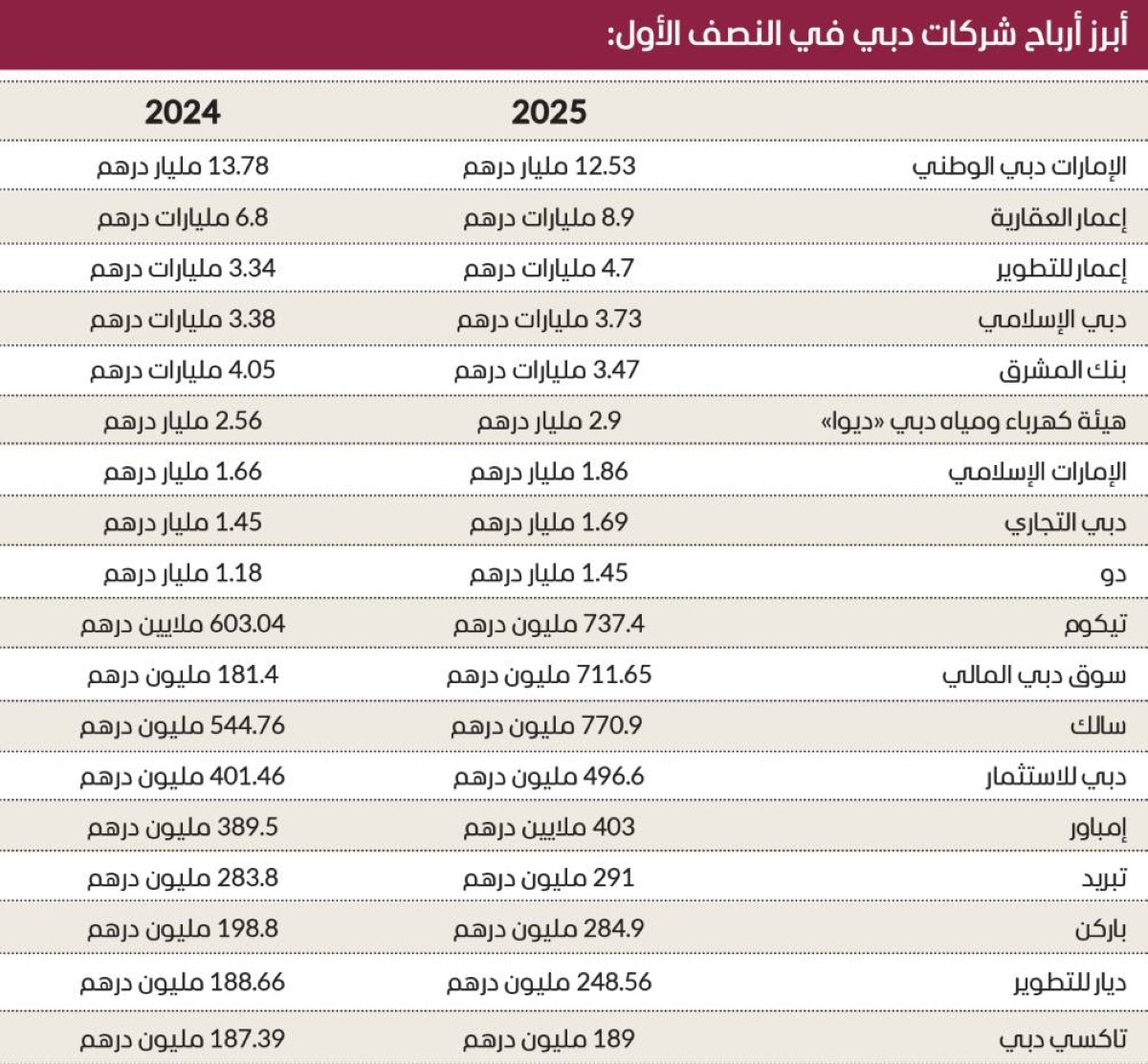 تصدر بنك الإمارات دبي الوطني الشركات الأكثر ربحية، بعد أن سجل أرباحاً صافية بقيمة 12.53 مليار درهم (شاملة أرباح الإمارات الإسلامي) خلال الستة أشهر الأولى من العام الجاري، فيما بلغت أرباحه قبل الضريبة 15.4 مليار درهم، وارتفعت إيراداته بنسبة 12 % لتصل إلى 23.9 مليار درهم.