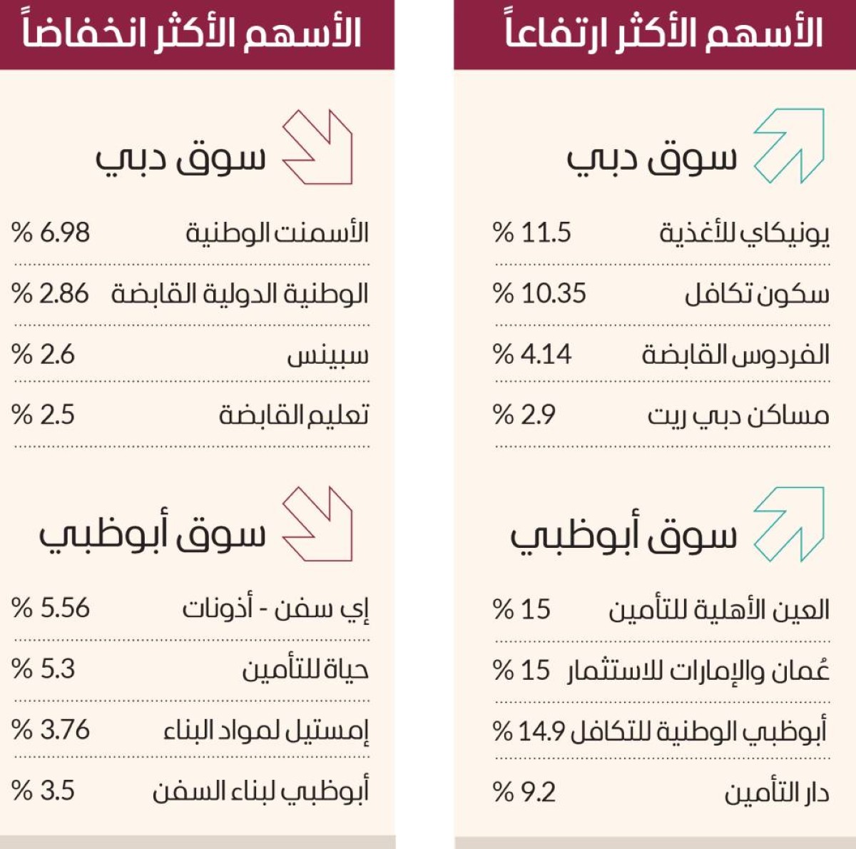 وارتفعت أسهم العين اﻷهلية للتأمين 15%، وعُمان والإمارات للاستثمار 15%، وأبوظبي الوطنية للتكافل 14.9%، ودار التأمين 9.2%، فيما انخفضت أسهم إي سفن - أذونات 5.56%، وحياة للتأمين 5.3%، وإمستيل لمواد البناء 3.76%، وأبوظبي لبناء السفن 3.5%.