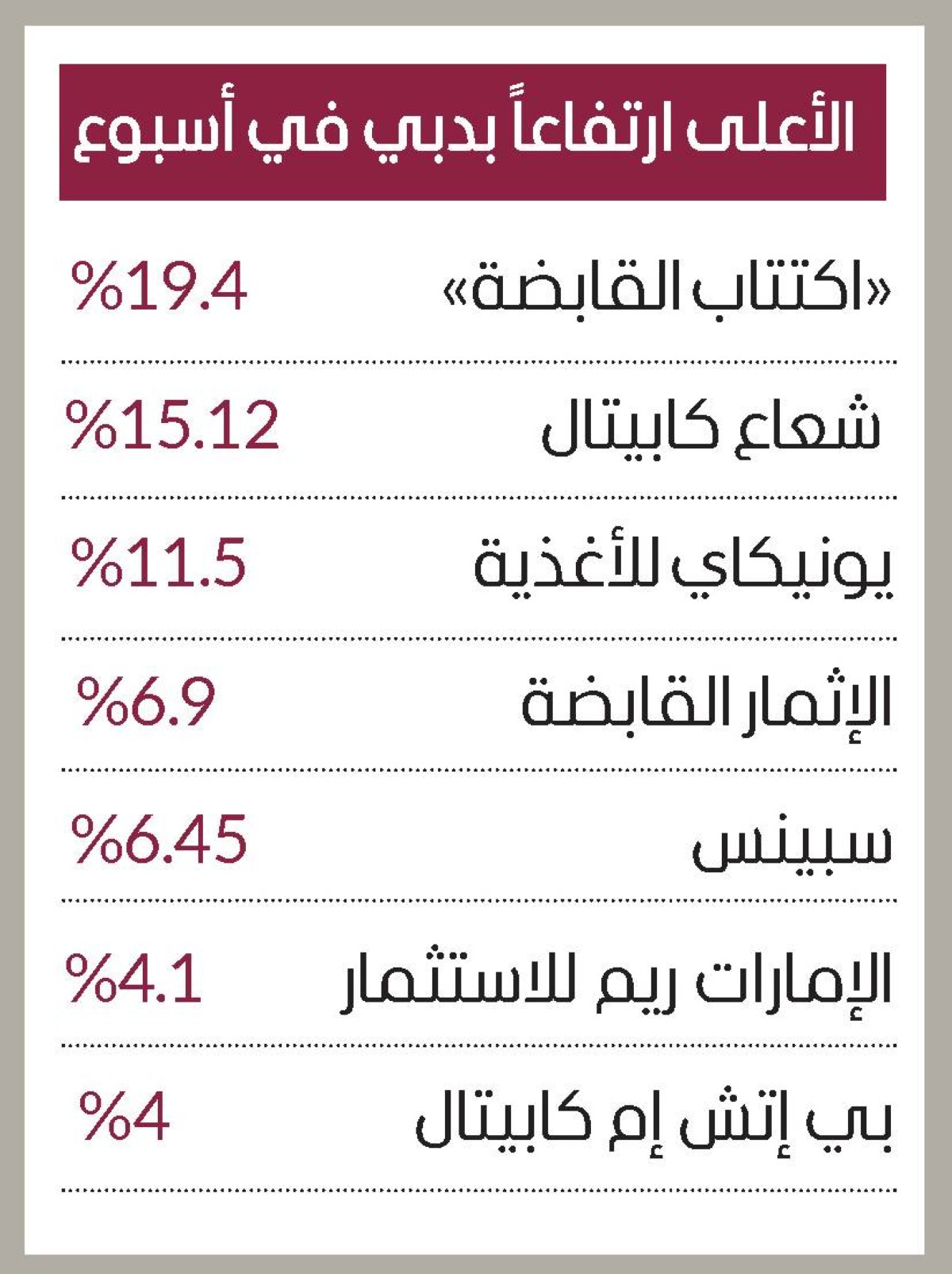 وفي أسبوع، تصدر سهم «اكتتاب القابضة» ارتفاعات أسهم سوق دبي ليقفز 19.4 %، وارتفعت أسهم شعاع كابيتال 15.12 %، ويونيكاي للأغذية 11.5 %، والإثمار القابضة 6.9 %، وسبينس 6.45 %، والإمارات ريم للاستثمار 4.1 %، وبي إتش إم كابيتال 4 %.
