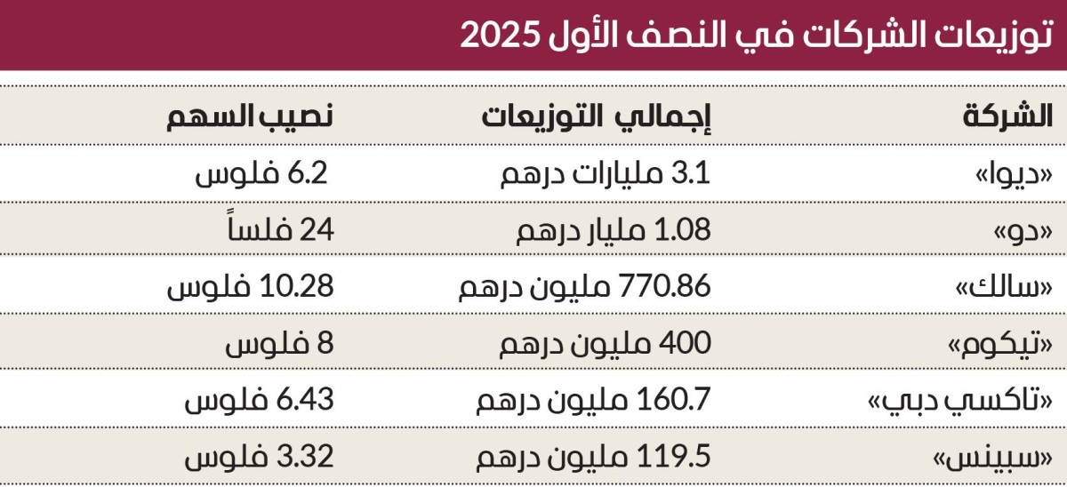 وجاء في المركز الثاني، شركة الإمارات للاتصالات المتكاملة «دو»، حيث وافق مجلس الإدارة للشركة المنعقد بتاريخ 24 يوليو 2025، على توزيع أرباح نقدية للمساهمين بقيمة 1.088 مليار درهم بنسبة 24% من رأس المال (ما يعادل 24 فلساً للسهم) عن النصف الأول 2025.