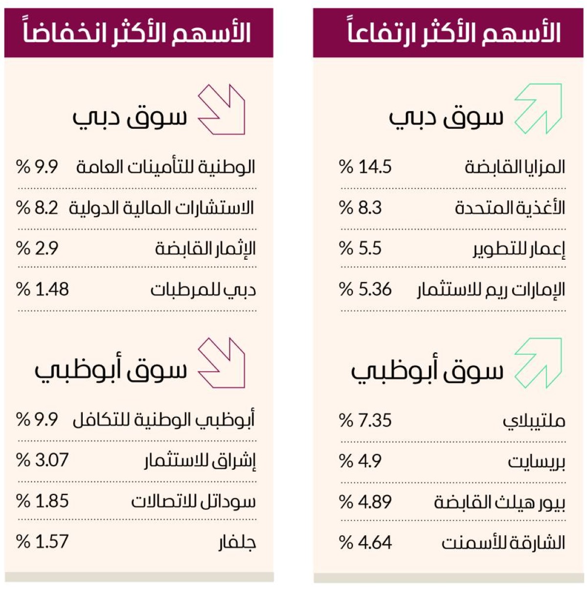 وتدعم أداء سوق دبي المالي بارتفاع أسهم الإمارات دبي الوطني 2.5%، وديوا 0.75%، وسالك 0.58%. في المقابل، تراجعت أسهم الوطنية للتأمينات العامة 9.9%، والاستشارات المالية الدولية 8.2%، والإثمار القابضة 2.9%، ودبي للمرطبات 1.48%.