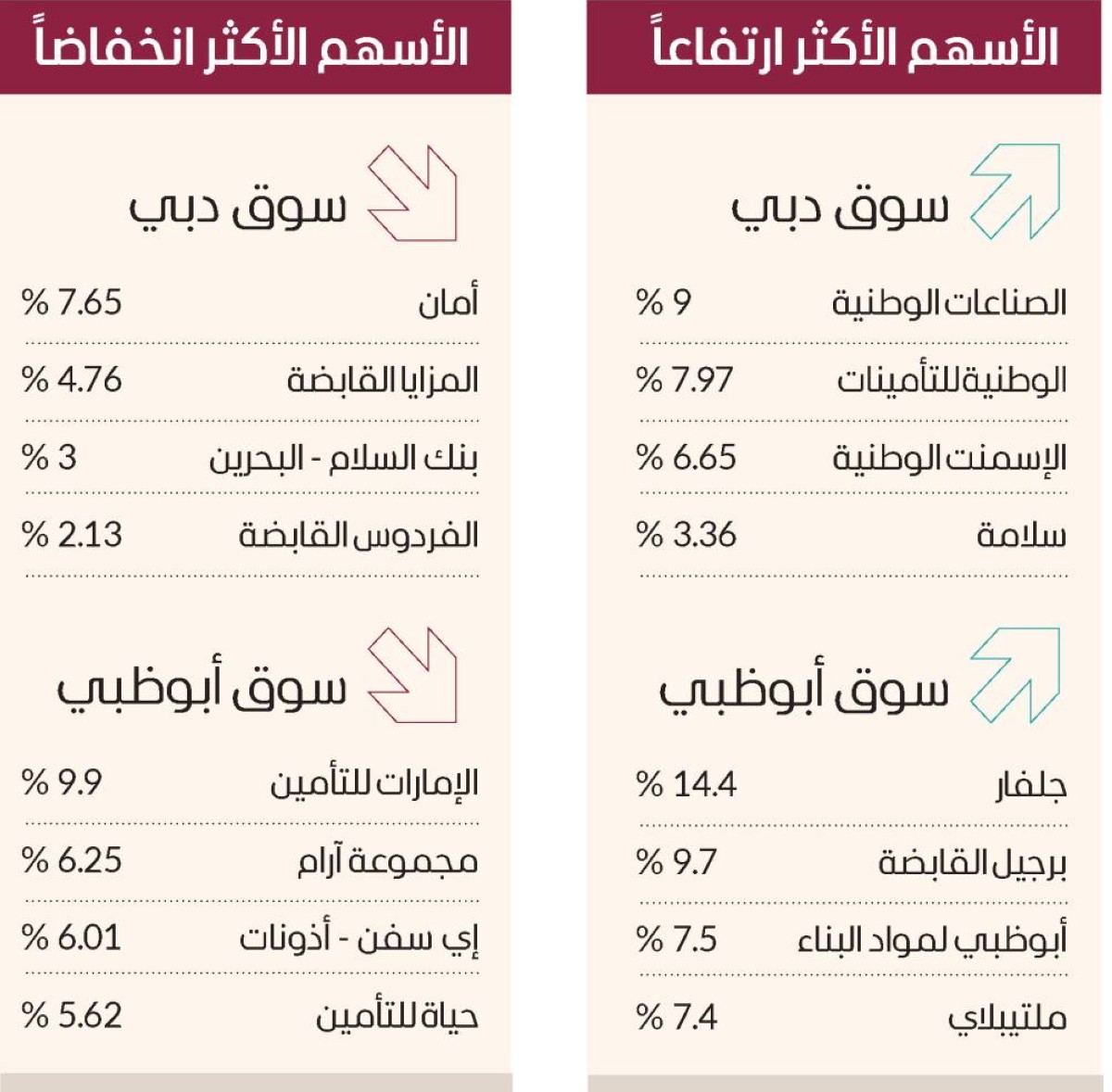 وارتفع في سوق أبوظبي أسهم جلفار 14.4% بالحد الأقصى، وبرجيل القابضة 9.7%، وأبوظبي الوطنية لمواد البناء 7.5%، وملتيبلاي 7.4%، في المقابل، انخفضت أسهم الإمارات للتأمين 9.9%، ومجموعة آرام 6.25%، وإي سفن- أذونات 6.01%، وحياة للتأمين 5.62%.