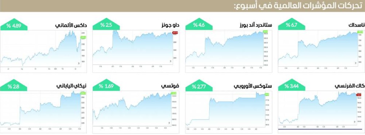4.89 % خلال الأسبوع المُنتهي في 25 أبريل، ليختتم التعاملات عند النقطة 22242.45، كذلك ارتفع مؤشر «كاك» الفرنسي بنحو 3.44 % منهياً تعاملات الأسبوع عند مستوى 7536.26 نقطة.