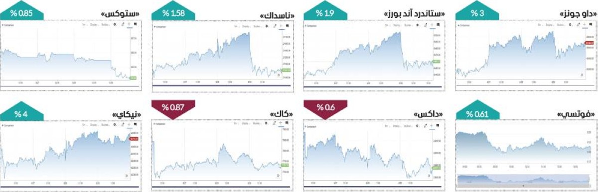 ففي «وول ستريت»، سجل مؤشر «ستاندرد آند بورز 500» مكاسب في أغسطس للشهر الرابع على التوالي، منهياً التعاملات عند مستوى 6460.26 نقطة، مقارنة بإغلاقه في نهاية يوليو عند النقطة 6339، وبارتفاع شهري 1.9 %، لتصل مكاسب المؤشر منذ بداية العام إلى 10 % تقريباً. كذلك ارتفع مؤشر «داو جونز» الصناعي بأكثر من 3 % في أغسطس، مغلقاً عند مستوى 45544.88 نقطة، مقابل 44130 بنهاية يوليو.