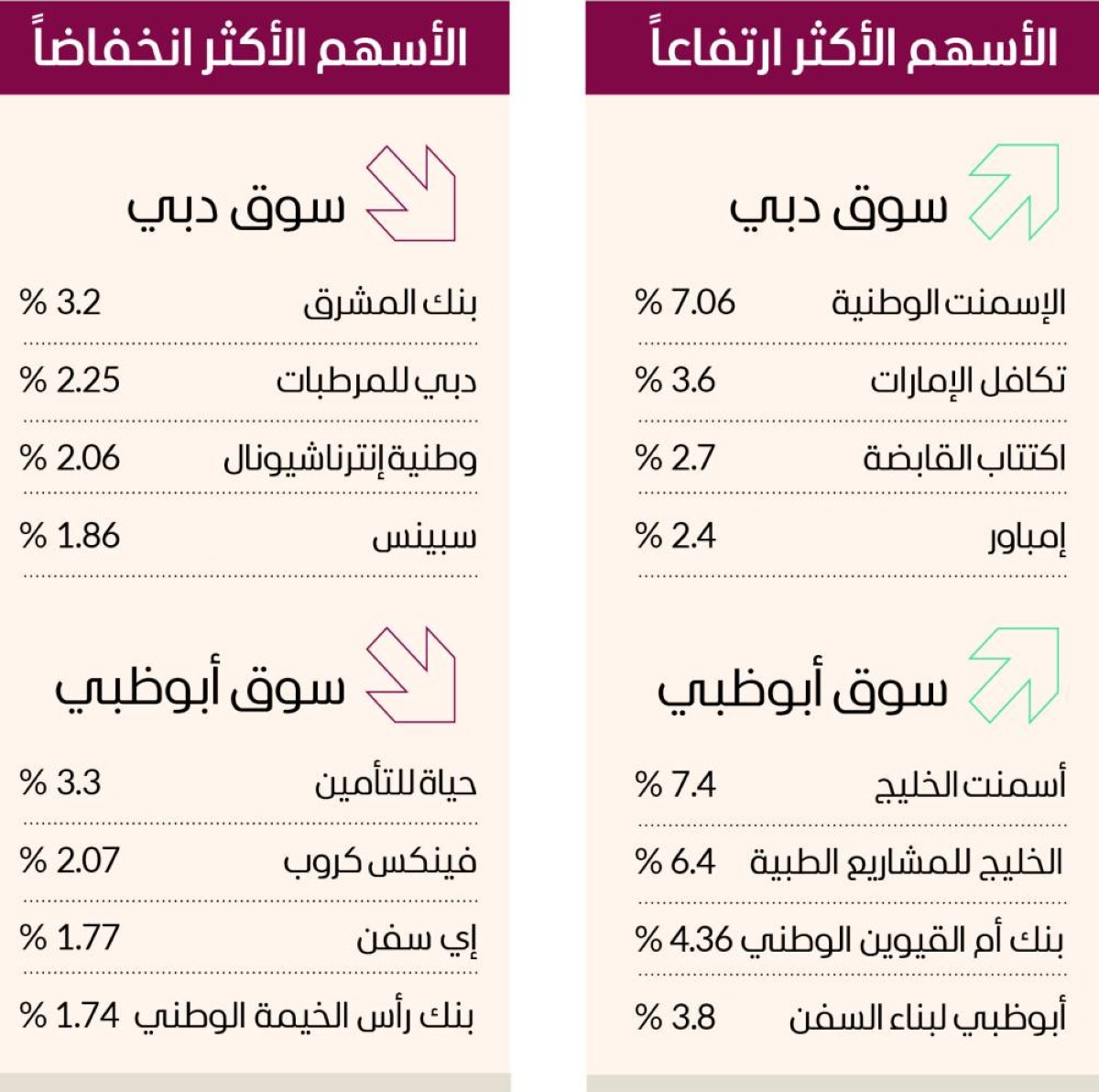 وارتفعت أسهم بنك أسمنت الخليج 7.4%، والخليج للمشاريع الطبية 6.4%، وبنك أم القيوين الوطني 4.36%، أبوظبي لبناء السفن 3.8%، فيما تراجعت أسهم حياة للتأمين 3.3%، وفينكس كروب 2.07%، وإي سفن 1.77%، وبنك رأس الخيمة الوطني 1.74%.