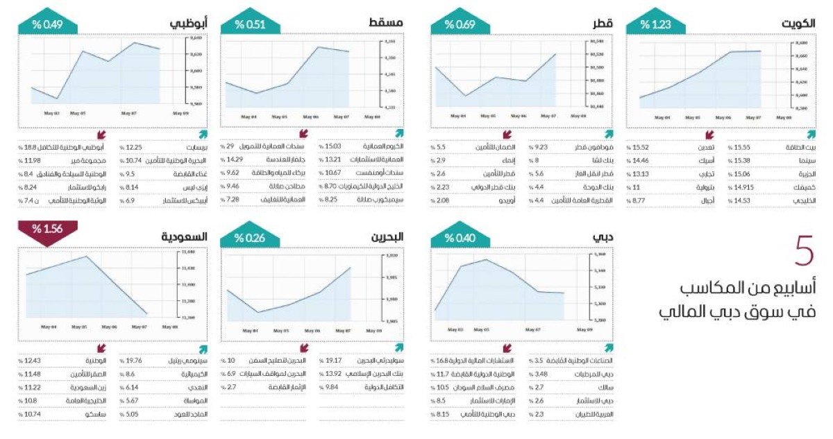 كما ارتفع مؤشر السوق العام بنسبة 0.8% مغلقاً عند 8,010.75 نقطة. وسجل مؤشر السوق الرئيس نمواً بنحو 1.34% في أسبوع، ليصل إلى النقطة 7197.26، رابحاً حوالي 95 نقطة مقارنة بمستوى إغلاق الأسبوع المنتهي في الأول من مايو.