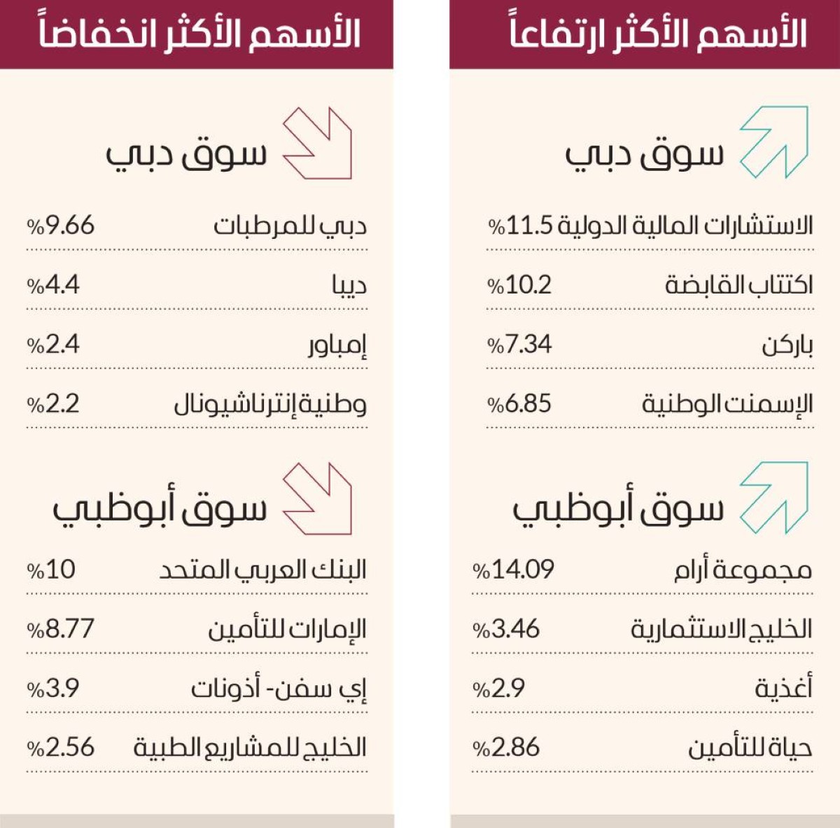وارتفعت في سوق دبي أسهم اكتتاب القابضة 10.2%، والإسمنت الوطنية 6.85%، والإمارات للاستثمار 6.7%، وشعاع كابيتال 3.65%، فيما تراجعت أسهم دبي للمرطبات 9.66%، وديبا 4.4%، وإمباور 2.4%، ووطنية إنترناشيونال 2.2%.