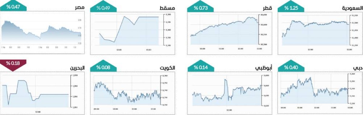 وعلى مستوى البورصات العربية، ارتفع مؤشر «تاسي» السعودي 1.25 %، والكويت 0.08%، وقطر 0.73%، ومسقط 0.49%، فيما تراجعت بورصة البحرين 0.18%، وخارج منطقة الخليج، صعد مؤشر بورصة مصر 0.47%.