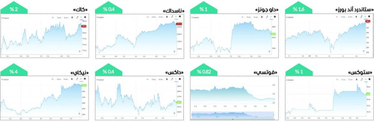 وشهدت مؤشرات الأسهم الأمريكية الرئيسية أداء إيجابياً خلال الأسبوع، مع بلوغ «ناسداك» المركب مستوى قياسياً مرتفعاً جديداً، كما سجل المؤشر الأوروبي مكاسب أسبوعية بنحو 1%، مع استيعاب المتداولين مجموعة من البيانات والأحداث السياسية، بما في ذلك الاضطرابات التي شهدتها فرنسا خلال الأسبوع، وهو ما تكرر في اليابان، حيث سجل نيكاي الياباني صعوداً أسبوعياً بعد استقالة رئيس الوزراء، وحركت عوامل مختلفة سوقي النفط والذهب في الأيام الأخيرة، لتقودهما إلى مكاسب أسبوعية جديدة.