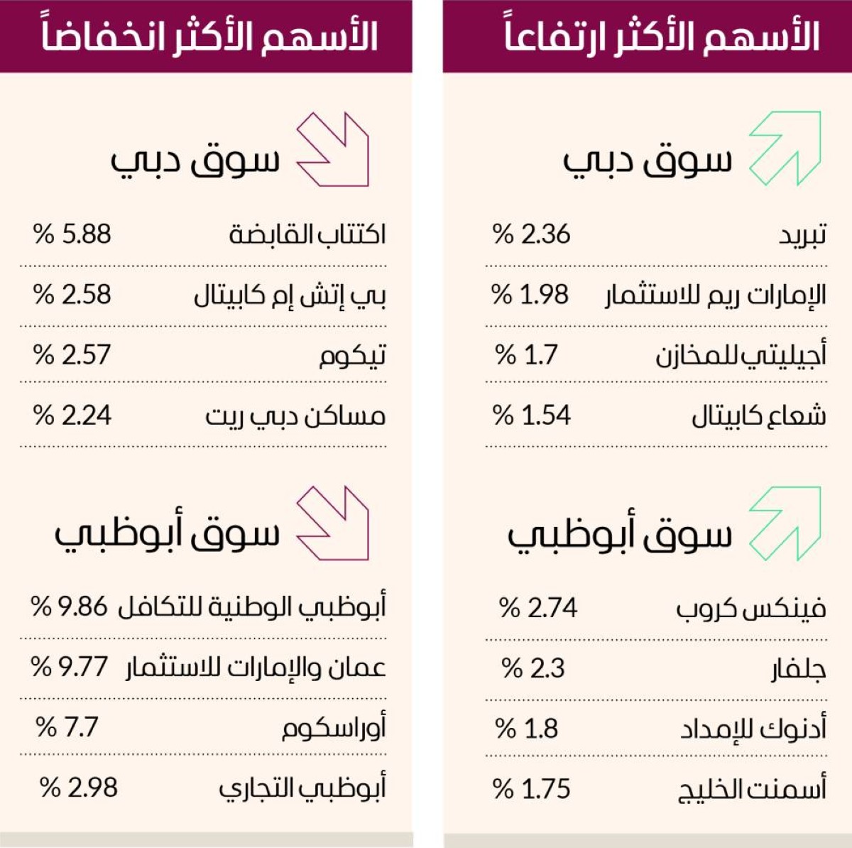 وكان ضمن الأسهم المرتفعة في سوق أبوظبي، أسهم فينكس كروب 2.74%، وجلفار 2.3%، وأدنوك للإمداد 1.8%، وأسمنت الخليج 1.75%، في المقابل، تراجعت أسهم أبوظبي الوطنية للتكافل 9.86%، وعمان والإمارات للاستثمار 9.77%، وأوراسكوم 7.7%، وأبوظبي التجاري 2.98%.
