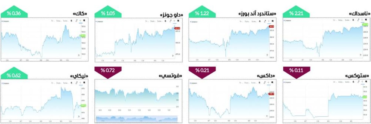 ووصل «داو جونز» الصناعي إلى النقطة 46315.27، مقارنة مع إغلاقه عند ختام تعاملات الأسبوع الماضي عند 45834.22 نقطة، بمكاسب أسبوعية 1.05 %. كما ارتفع مؤشر «ستاندرد آند بورز 500» بنسبة 1.22 %، إلى مستوى 6664.36 نقطة، مقارنة مع 6584.29 نقطة الأسبوع الماضي.