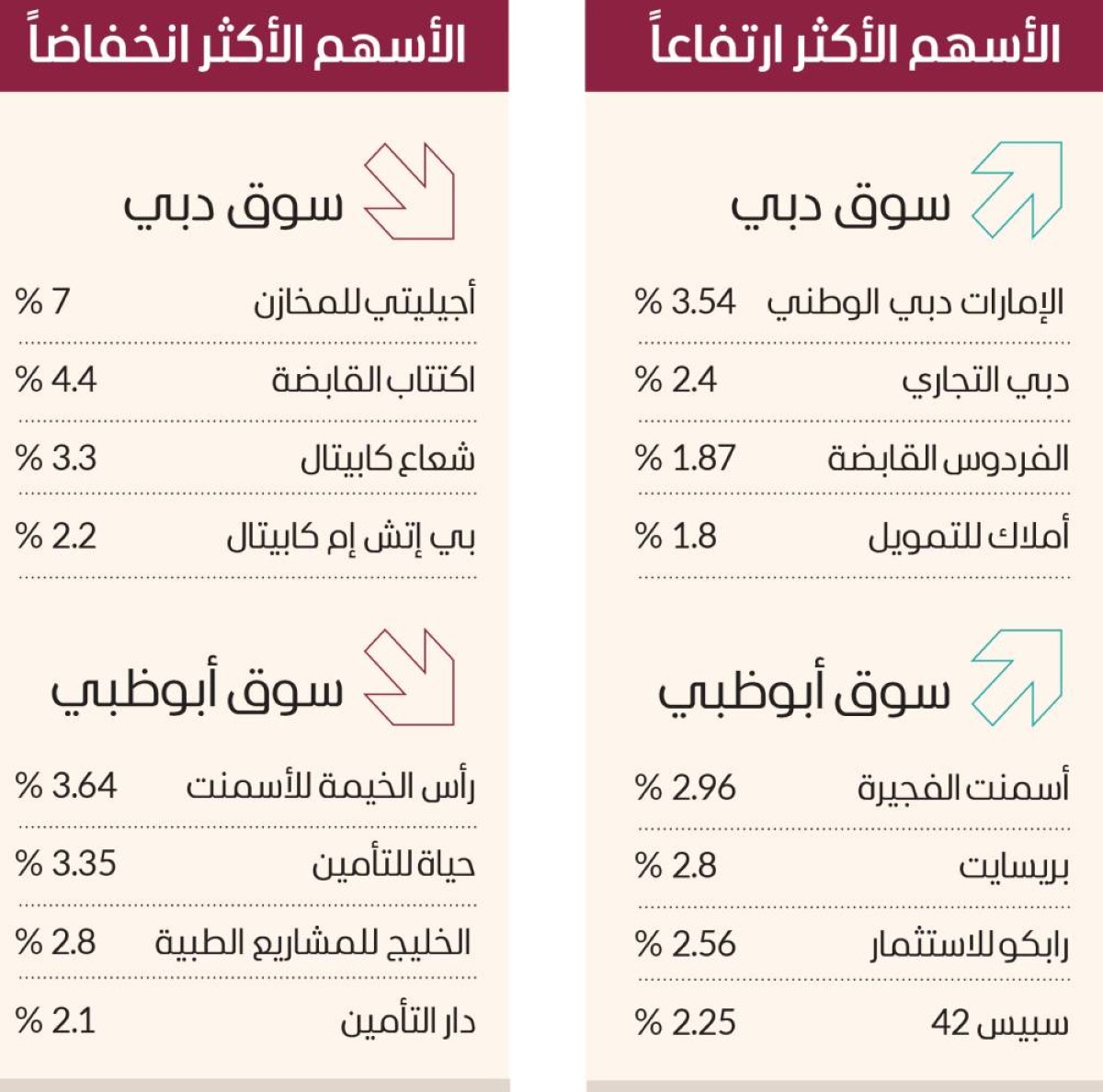 وصعدت في سوق دبي المالي أسهم الفردوس القابضة 1.87%، وأملاك للتمويل 1.8%، فيما انخفضت أسهم أجيليتي للمخازن 7%، واكتتاب القابضة 4.4%، وشعاع كابيتال 3.3%، وبي إتش إم كابيتال 2.2%.