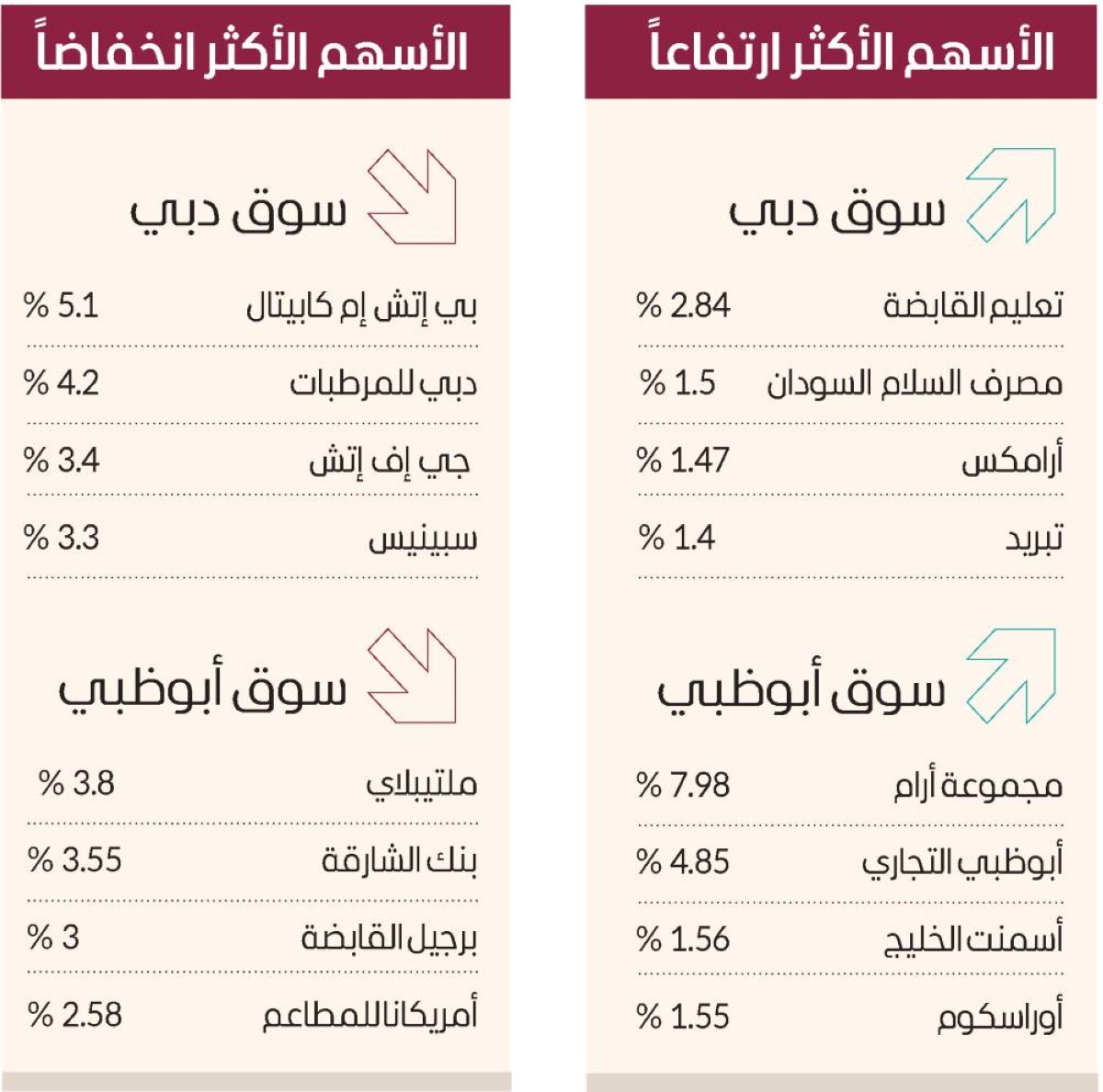 وكان ضمن الأسهم المرتفعة في سوق أبوظبي أسهم مجموعة أرام 7.98 %، وأبوظبي التجاري 4.85 %، وأسمنت الخليج 1.56 %، وأوراسكوم 1.55 %، في المقابل، تراجعت أسهم ملتيبلاي 3.8 %، وبنك الشارقة 3.55 %، وبرجيل القابضة 3 %، وأمريكانا للمطاعم 2.58 %.