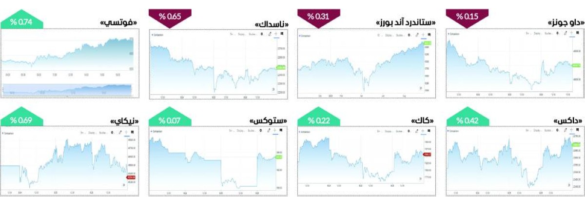 وبينما سجلت المؤشرات الرئيسة في «وول ستريت» هذا الأسبوع محصلة حمراء، نجحت المؤشرات الأوروبية في تسجيل مكاسب نسبية، كما واصل المؤشر الياباني تسجيل مستويات فوق 45 ألف نقطة.