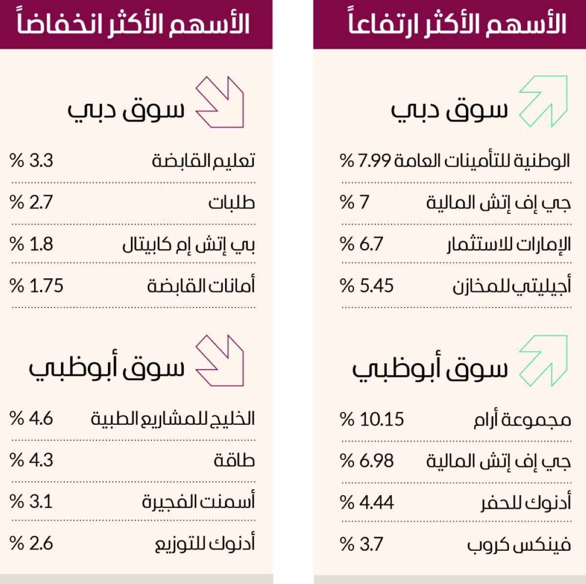 وارتفعت في سوق أبوظبي أسهم مجموعة أرام 10.15%، وجي إف إتش المالية 6.98%، وأدنوك للحفر 4.44%، وفينكس كروب 3.7%، في المقابل تراجعت أسهم الخليج للمشاريع الطبية 4.6%، وطاقة 4.3%، وأسمنت الفجيرة 3.1%، وأدنوك للتوزيع 2.6%.