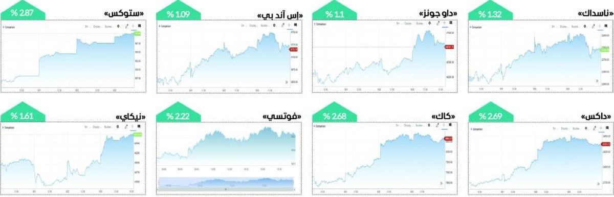 كما اقتفت المؤشرات الأوروبية أثر «وول ستريت»، لتسجل مكاسب جديدة؛ حيث حقق «ستوكس 600» أكبر مكسب أسبوعي في خمسة أشهر. كذلك ارتفع مؤشر «نيكاي» الياباني وسط ترقب لمسار السياسات النقدية من قبل بنك اليابان، وكذلك المتغيرات السياسية في طوكيو.