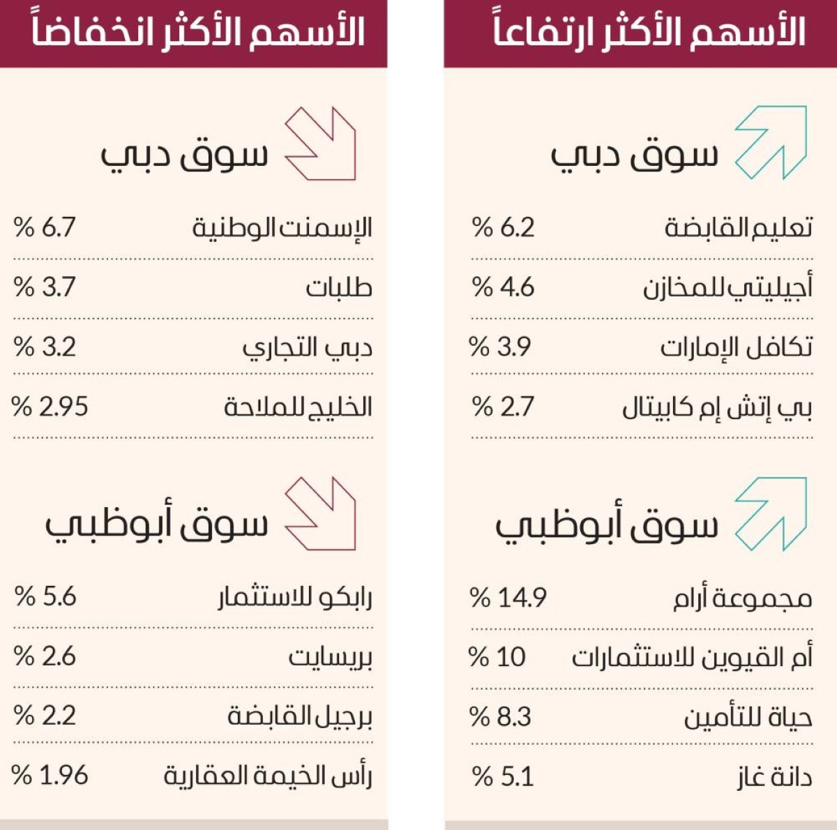 وسجل سهما «أدنوك للحفر» و«أدنوك للإمداد» أعلى مستوى لهما منذ إدراجهما في سوق أبوظبي للأوراق المالية. وارتفعت في سوق أبوظبي أسهم مجموعة أرام 14.9 %، وأم القيوين للاستثمارات 10 %، وحياة للتأمين 8.3 %، دانة غاز