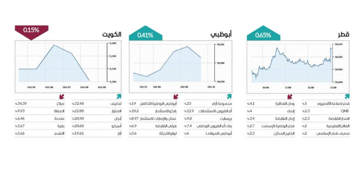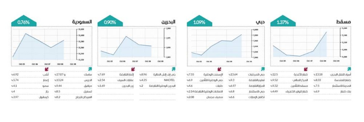 تصدر مؤشرا سوق دبي المالي وبورصة مسقط ارتفاعات البورصات العربية في الأسبوع الثاني من شهر أكتوبر، وسط أداء إيجابي للأسواق. في حين يترقب المستثمرون انطلاق موسم نتائج أعمال الشركات عن الربع الثالث من عام 2025، في محاولة لاستشراف اتجاهات النمو والأرباح المتوقعة.