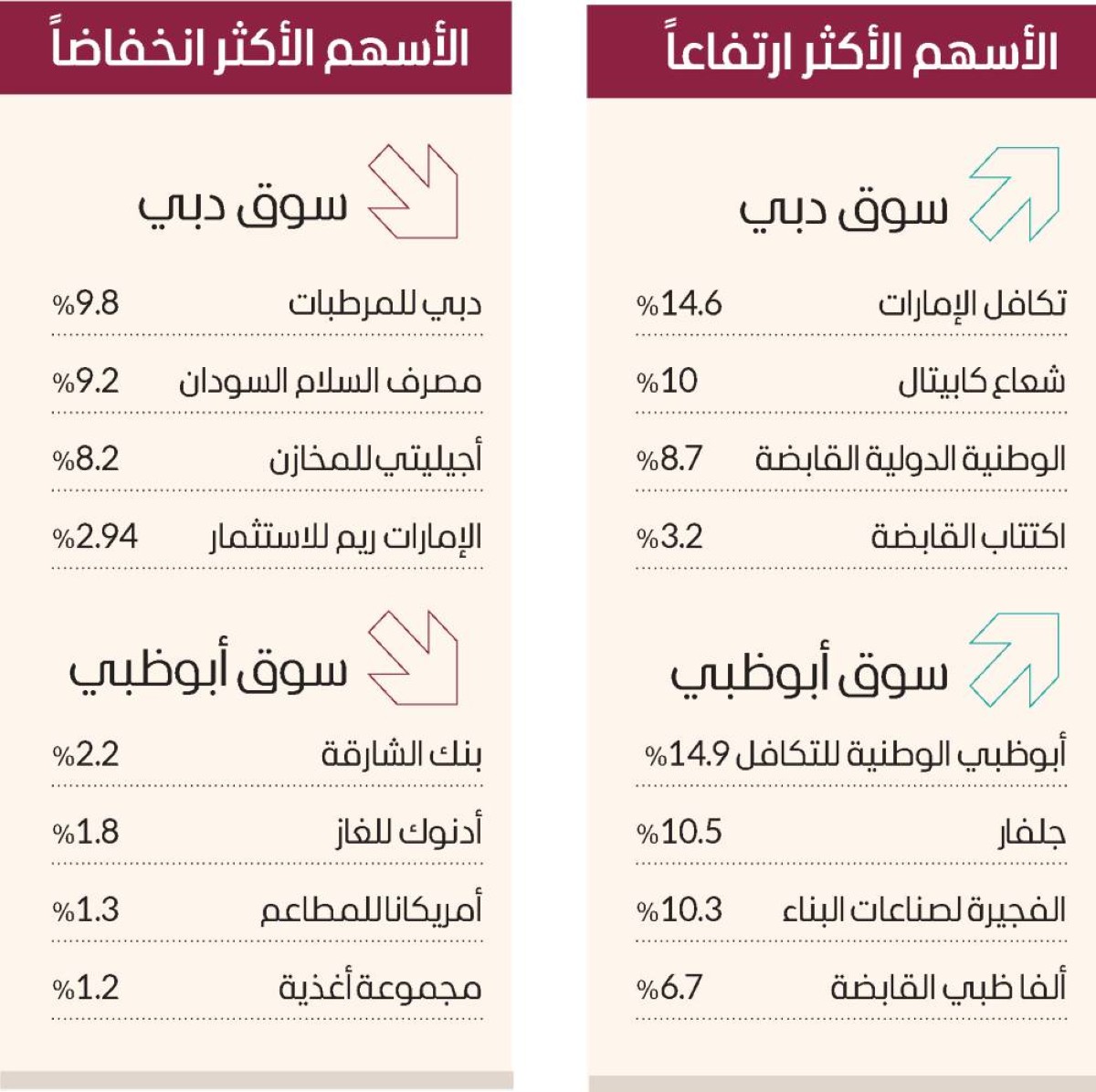 وفي سوق أبوظبي، قفز سهم «أبوظبي الوطنية للتكافل» بالحد الأقصى عند 5.33 دراهم ، وصعدت أسهم «جلفار» 10.5%، و«الفجيرة لصناعات البناء» 10.3%، و«ألفا ظبي القابضة» 6.7%، و«ملتيبلاي» 0.9%.