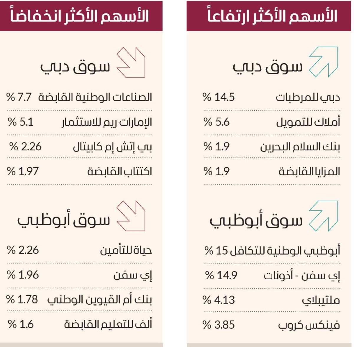 فيما انخفضت أسهم الصناعات الوطنية القابضة 7.7%، والإمارات ريم للاستثمار 5.1%، وبي إتش إم كابيتال 2.26%، واكتتاب القابضة 1.97%.