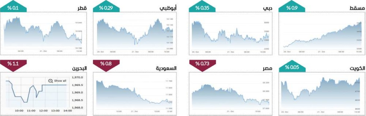 خليجياً أنهى مؤشر سوق مسقط بنمو 0.9% إلى مستوى 5240 نقطة تلاه مؤشر السوق الكويتي بنمو 0.05% إلى مستوى 9443 نقطة ثم مؤشر السوق القطري بنمو 0.1% إلى مستوى 10821 نقطة.
