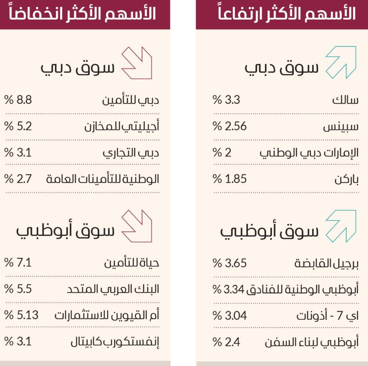 وارتفعت في سوق أبوظبي أسهم برجيل القابضة 3.65%، وأبوظبي الوطنية للفنادق 3.34%، وإي 7 - أذونات 3.04%، وأبوظبي لبناء السفن 2.4%، في المقابل، انخفضت أسهم حياة للتأمين 7.1%، والبنك العربي المتحد 5.5%، وأم القيوين للاستثمارات 5.13%، وإنفستكورب كابيتال 3.1%.